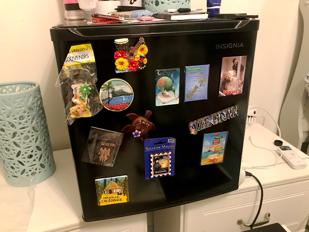 Trying out my souvenir magnets on my room’s fridge