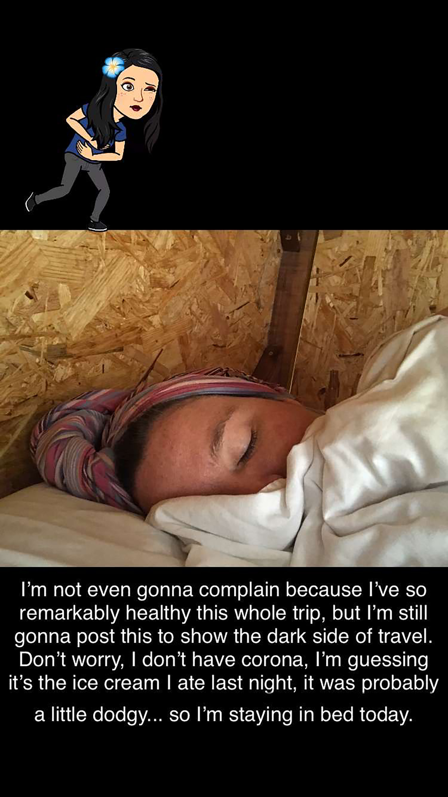 Laura had left for a tour at this time and the only other people in my dorm room thought I had COVID 19 so they stayed well clear of me 😛